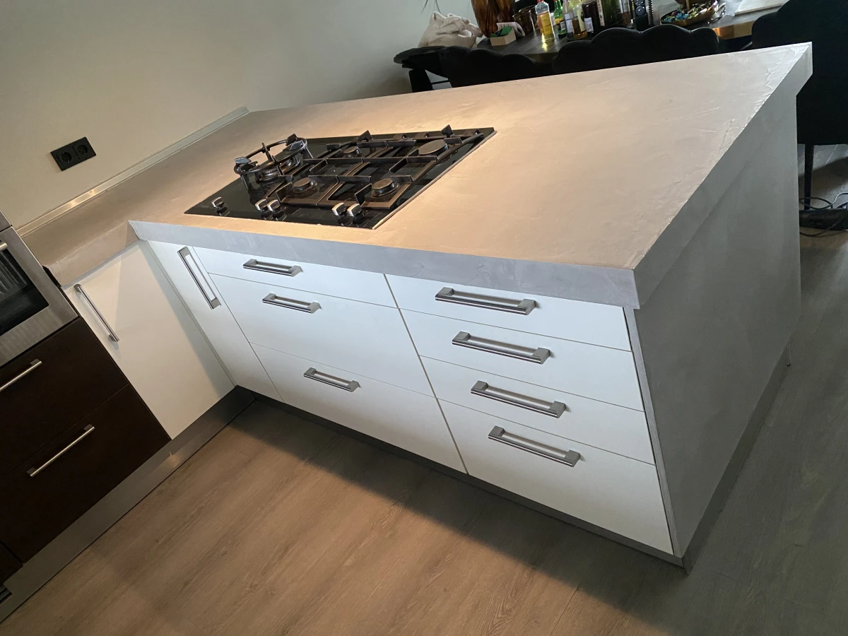 Bij deze keuken hebben wij het aanrechtblad voorzien van een betonlook. Zoals u ziet geeft dit een robuuste uitstraling aan uw keuken. Het mooie is wij kunnen dit over uw oude aanrechtblad heen maken.
